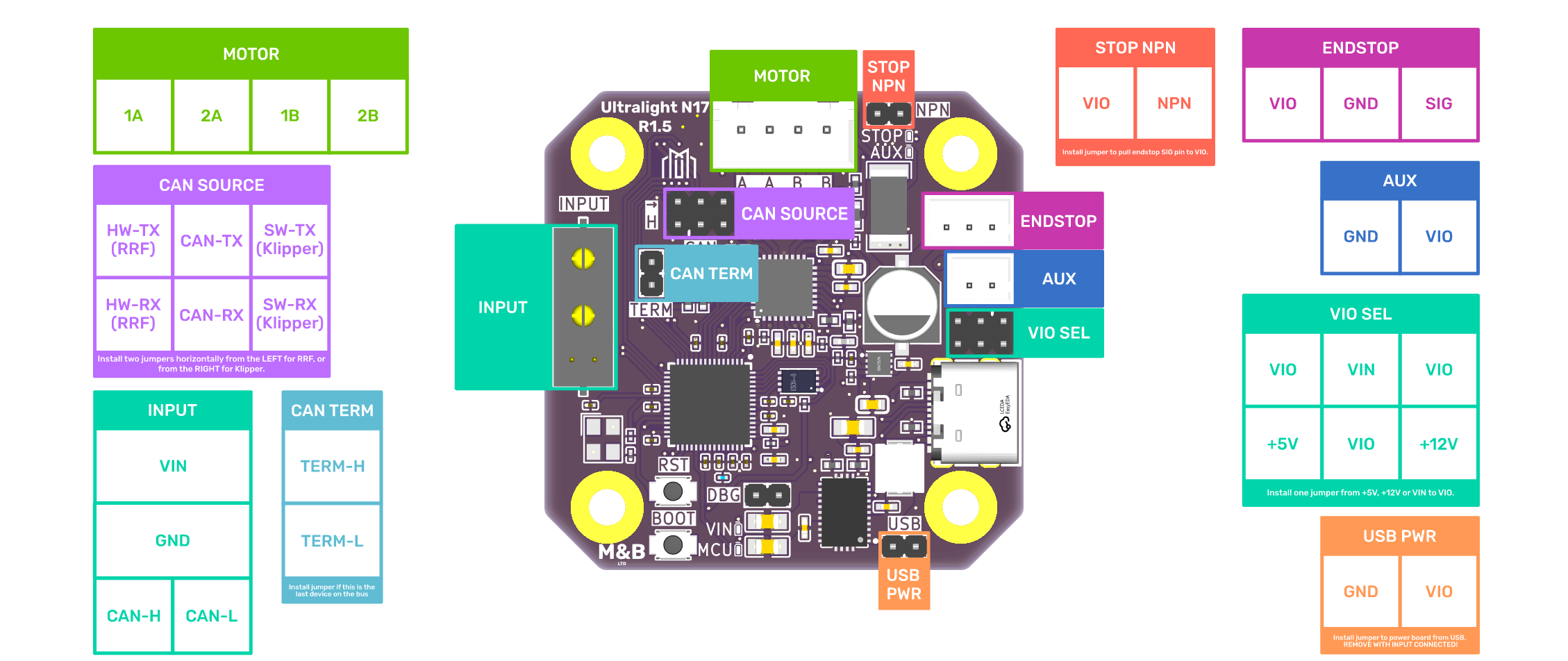 INPUTconnector - for your VIN and CAN(-FD)MOTORconnector - for your NEMA17 stepper motor